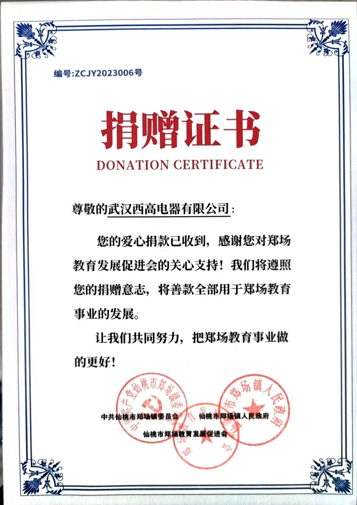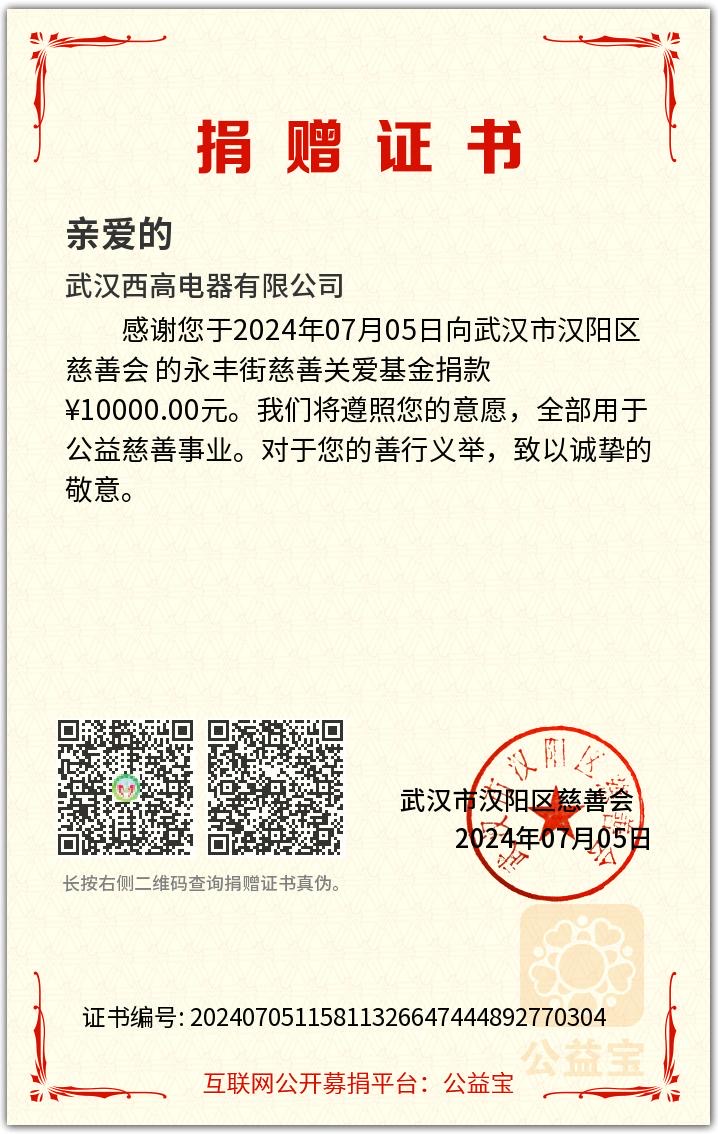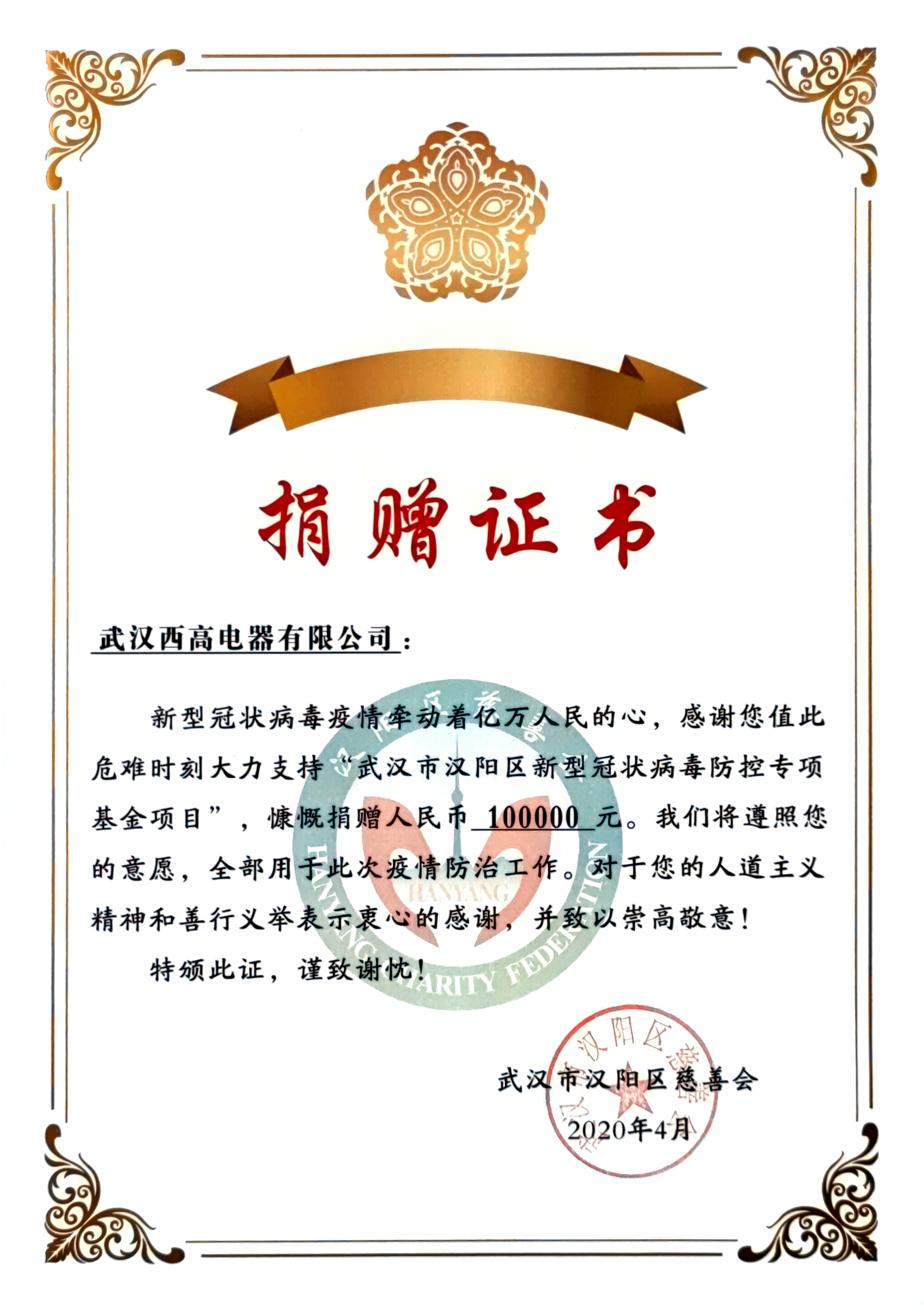 2020年初春新冠疫情在武漢爆發(fā),西高集團(tuán)第一時(shí)間捐款10萬(wàn)元人民幣至漢陽(yáng)區(qū)